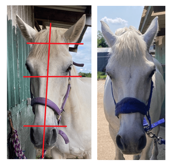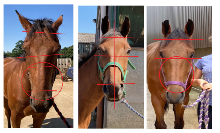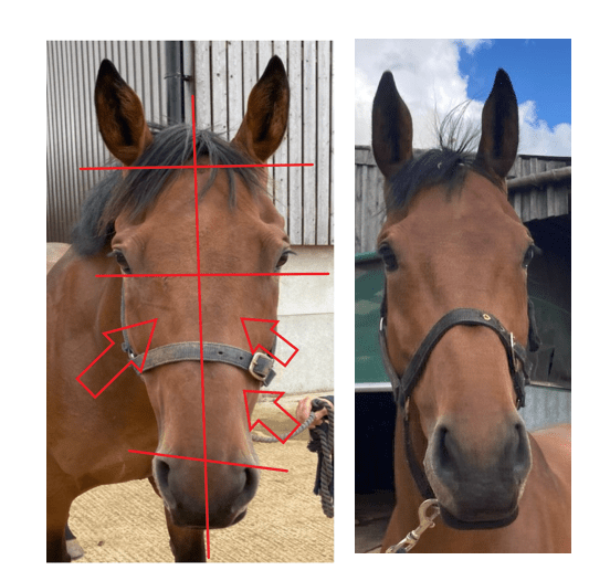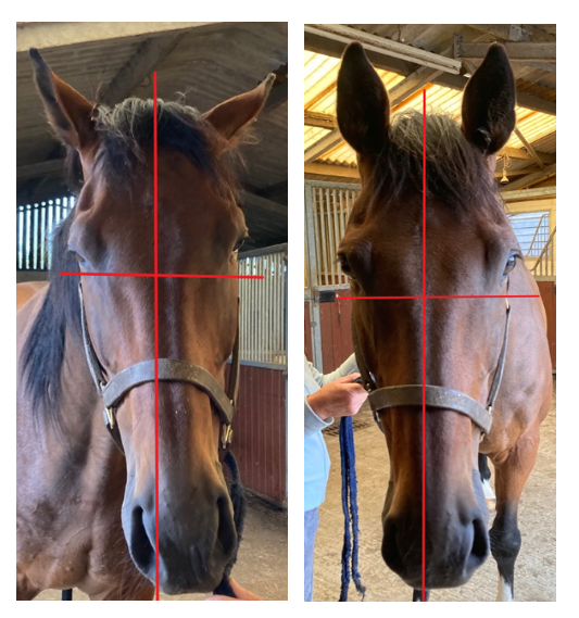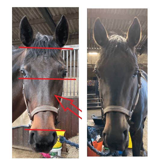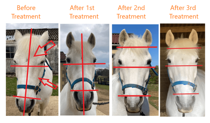 He had hit his head a couple of times on the top of his stable, this meant he was unable to hold his head straight, his face is balancing outYou can see once we balance the head his body has settled into a more comfortable posture. his head is no longer limited in the turn.